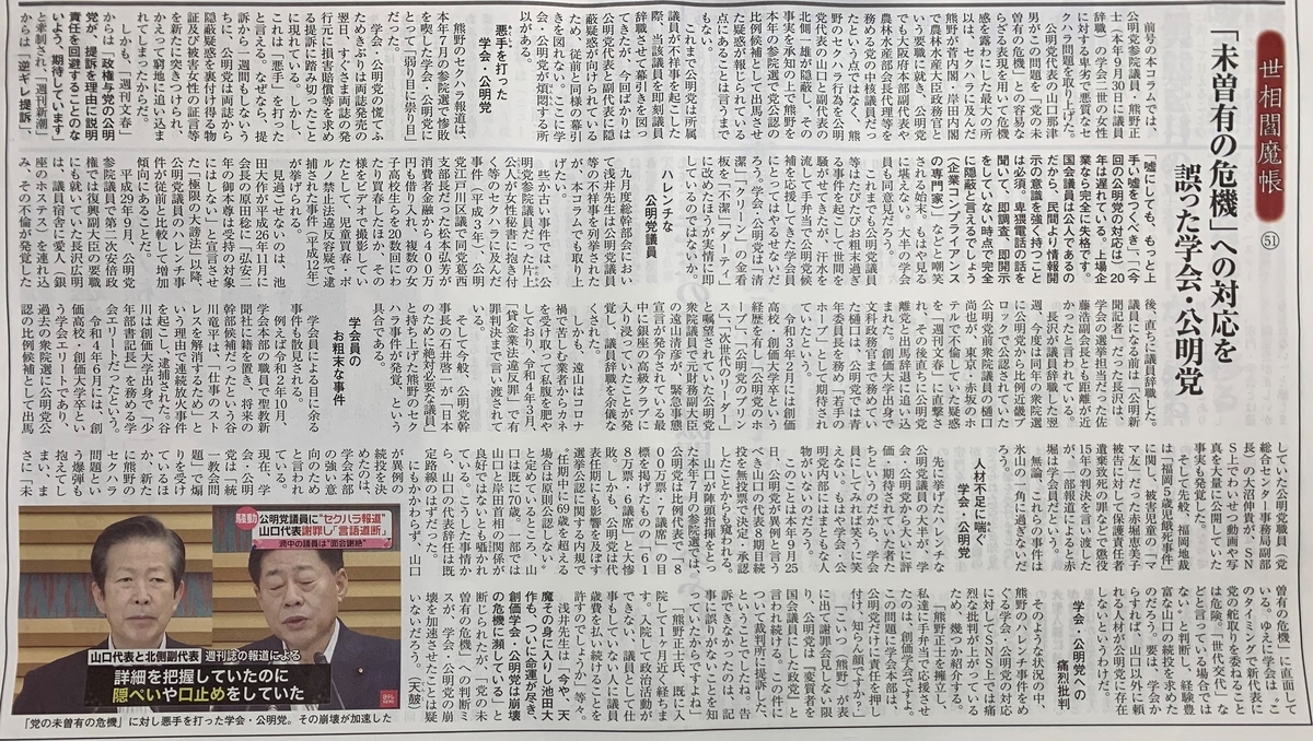 前号の本コラムでは、公明党参院議員・熊野正士(本年9月30日に議員辞職)の学会二世の女性に対する卑劣で悪質なセクハラ問題を取り上げた。